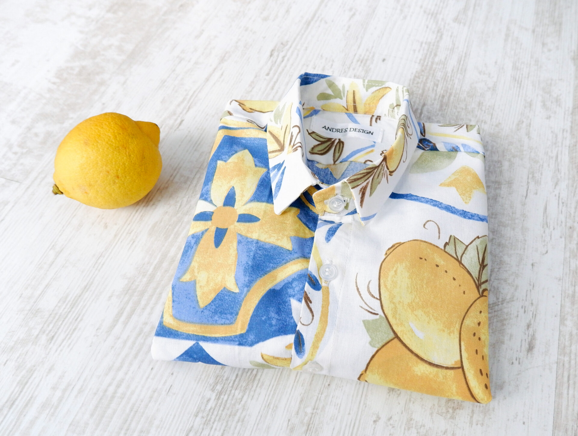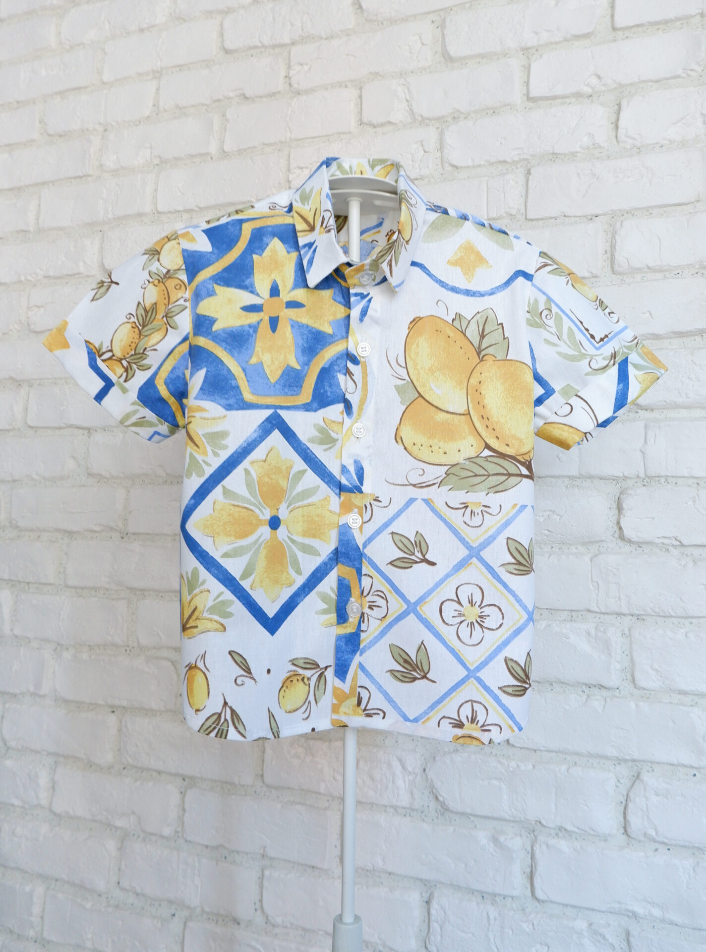 Camasa cu maneca scurta pentru copii, creata pe masurile fiecaruia, din bumbac cu un print vesel si plin de culoare.